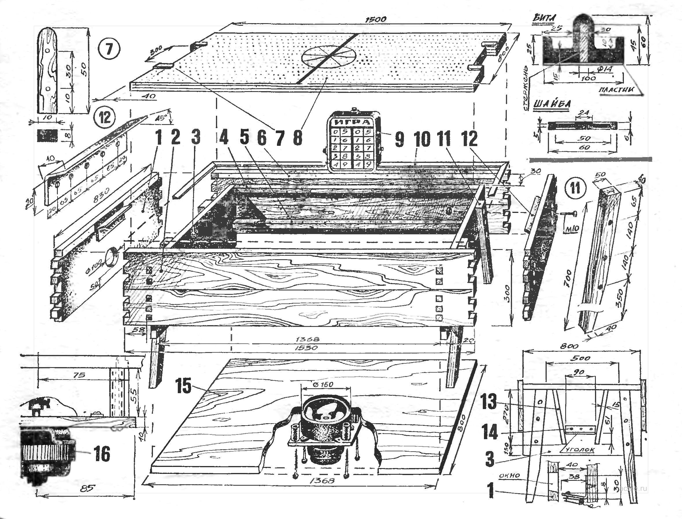 Для сбора корпуса самодельного аэрохоккея нужно иметь раму с ножками, игровое поле и днище. Корпус можно изготовить из древесно-стружечных плит или досок, которые нужно будет обшить фанерой, оргалитом или шпоном. Рама сбивается из стенок 1, 2, 3, при этом стенка 3 несет основную нагрузку, поэтому для нее нужно использовать доски толщиной 20 мм. Для других стенок можно использовать доски боле тонкие. Стенки 2 и 3 нужно обшить фанерой (шпоном) или оргалитом. С помощью 3-х 10-мм болтов ножки крепятся к стенкам. Очень важно правильно просверлить отверстия в стенках 1 и 3. Вначале нужно просверлить одно отверстие, и стянуть болтом ножку со стенкой. Затем нужно сделать второе отверстие, и вставить в него болт, и после этого еще просверлить третье отверстие. Потом на стенке 3 установить ловушку, которая собирается из двух реек и уголка. В стенке 1 нужно прорезать окно для шайбы, и сверху укрепить козырек, и после этого стенку закрепить на корпусе стола. Игровое поле изготавливается из досок. Для того чтобы его поверхность была гладкой и ровной, необходимо на доски налить органит, а на него – пластик. Затем нужно поле разделить на клетки размером 20х20 мм, и в точках пересечения линий просверлить отверстия диаметром 1 мм. Круг и центральную линию лучше разметить не краской, а йодом или раствором марганцовки, а ограничители покрыть яркой краской. По всему периметру стола нужно проложить стальную полосу толщиной 1,5 мм и шириной 8 мм, и ее закрепить шурупами с потайной головкой. С помощью шурупов закрепить дно стола. Затем в центре стола нужно сделать отверстие, точно соответствующее размеру цилиндра вентилятора. Следует помнить, что полость внутри стола должна быть герметичной. Поэтому, перед тем как крепить дно к рейкам нужно зашпаклевать пластилином или замазкой все щели в стенках. Также нужно пластилином или герметиком промазать рейки, к которым прибивается дно. Раму нужно прикрепить сверху бортика, чтобы шайба не вылетала с поля. Собранный стол нужно покрыть мебельным лаком НЦ-222. Такой аксессуар для самодельного аэрохоккея, как вентилятор, можно использовать от кухонной вытяжки, его следует выбирать с мощностью двигателя в пределах 40-80 Вт. Обычно вентилятор устанавливается на фанерном основании, которое с помощью шурупов крепится к днищу, только нужно обязательно пластилином (герметиком) промазать щель между корпусом и днищем. Также аксессуарами для самодельного аэрохоккея являются шайба и бита. Шайба и бита вытачиваются на токарном станке, только шайба изготавливается из полиэтилена, винипласта или полистирола, а бита из твердого дерева. Для утяжеления биты нужно в центре просверлить отверстие и вставить в него болт или металлический стержень. Для улучшения скольжения биты нужно к нижней ее части приклеить диск из пластика.